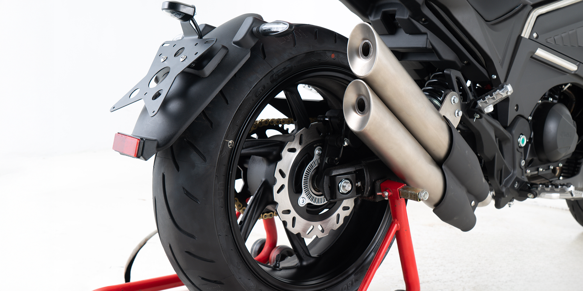 The 180/55-ZR17 wide rear tire design significantly increases the contact area with the ground, enhancing grip, making cornering more stable and acceleration more powerful.