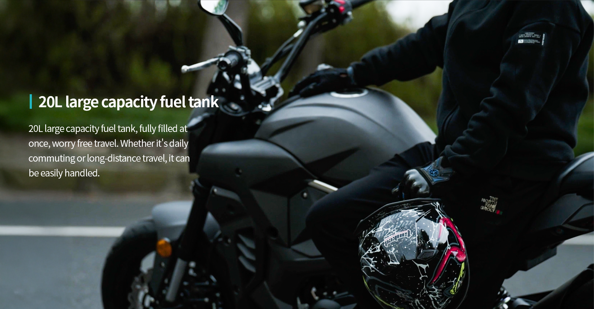 The 20L large-capacity fuel tank reduces refueling frequency, paired with excellent fuel efficiency, offering reliable range for long-distance rides.