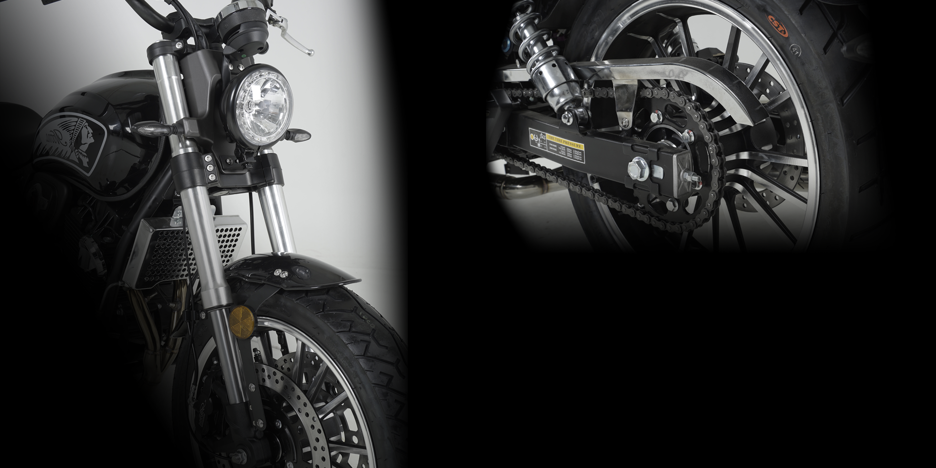 Спортивные бескамерные шины размерности 110/70-17 (передняя) и 140/70-17 (задняя) обеспечивают уверенное сцепление с любым типом дорожного покрытия.