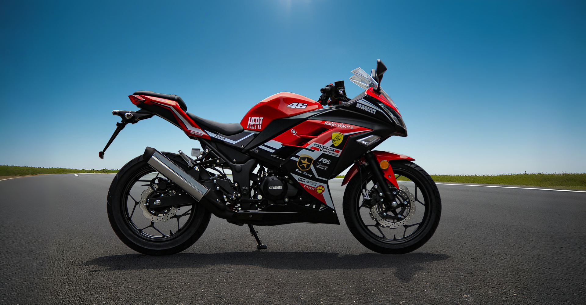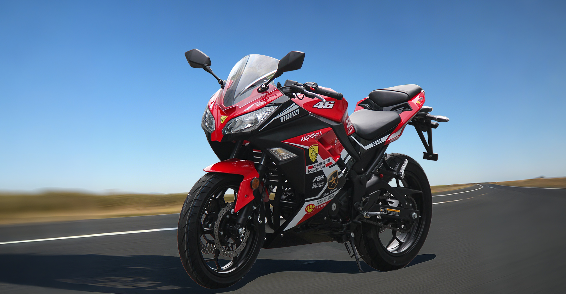 Спортивные бескамерные шины размерности 110/70-17 (передняя) и 140/70-17 (задняя) обеспечивают уверенное сцепление с любым типом дорожного покрытия.