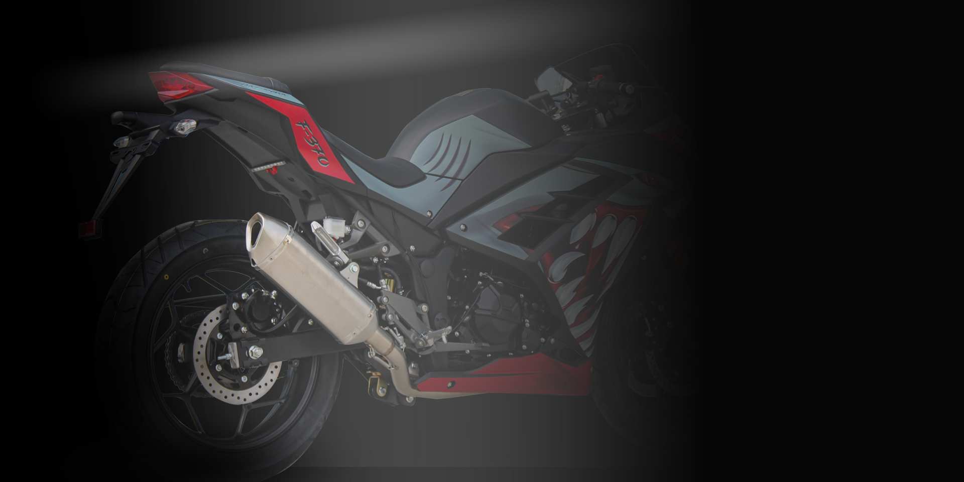 Глушитель скорпиона, совместимый с двухцилиндровым двигателем объемом 400 куб. см водяным охлаждением, обеспечивает мощный звук выхлопа.