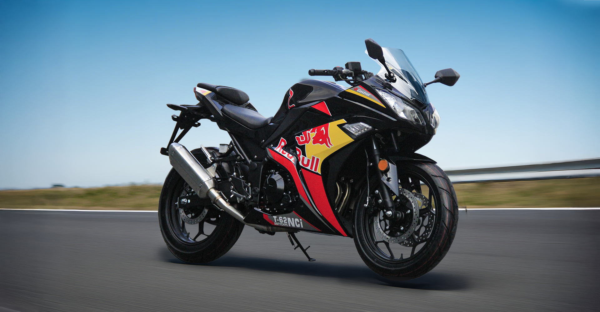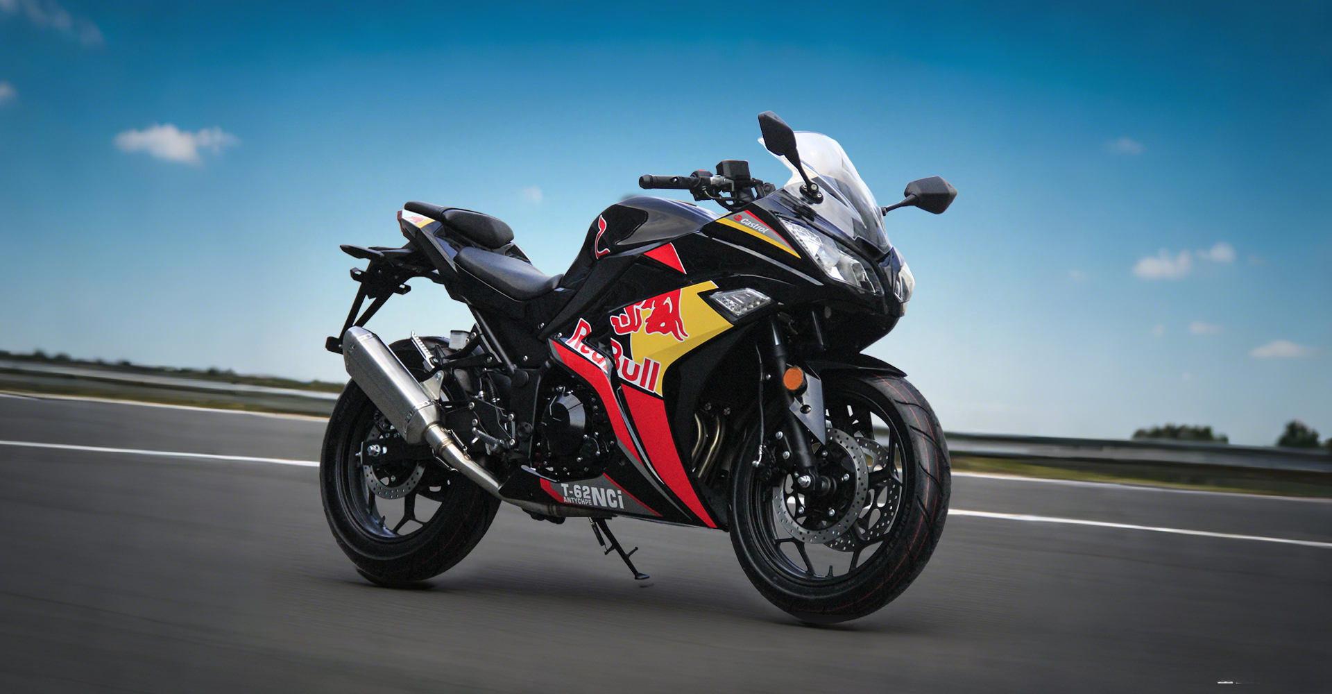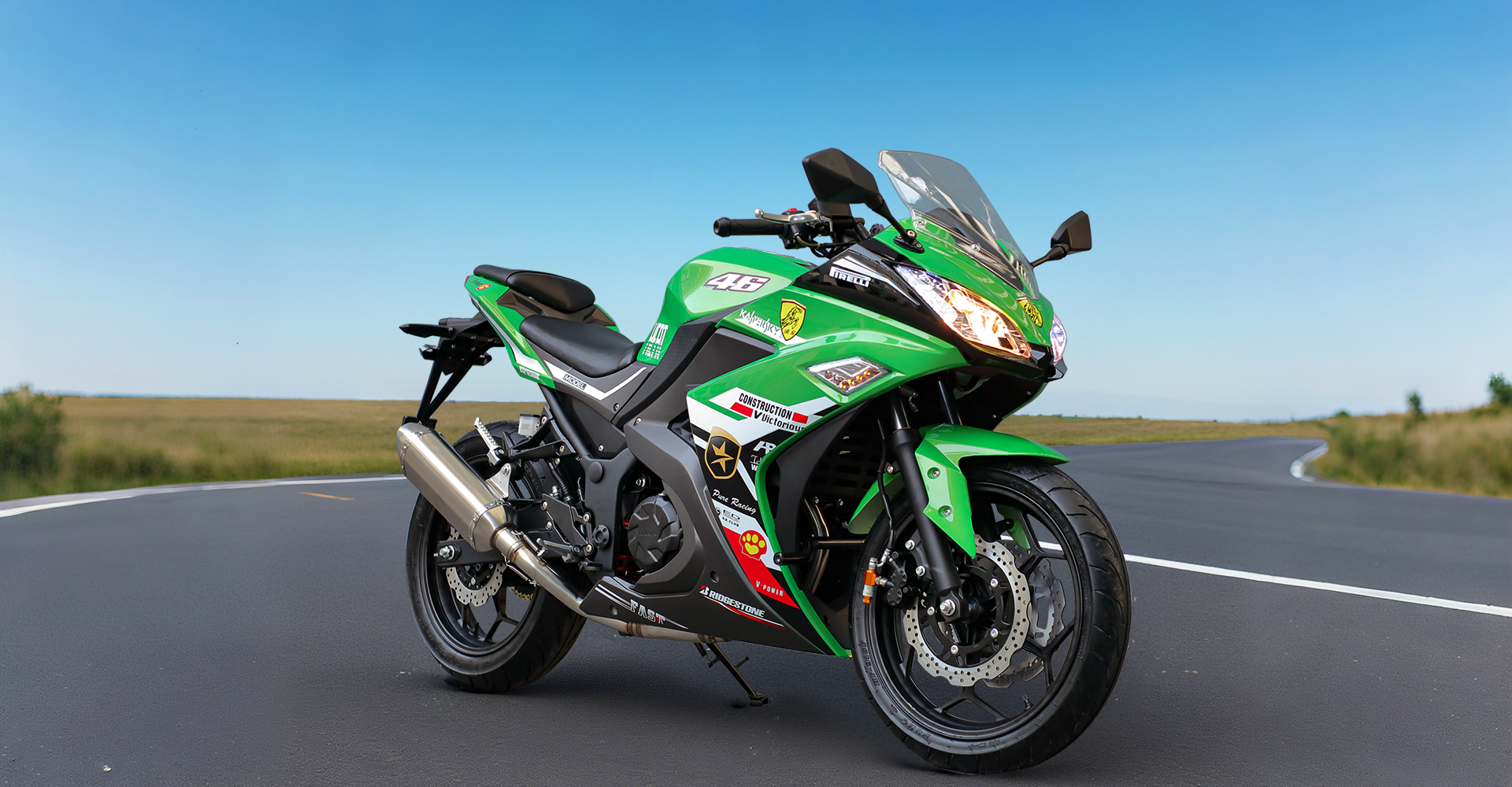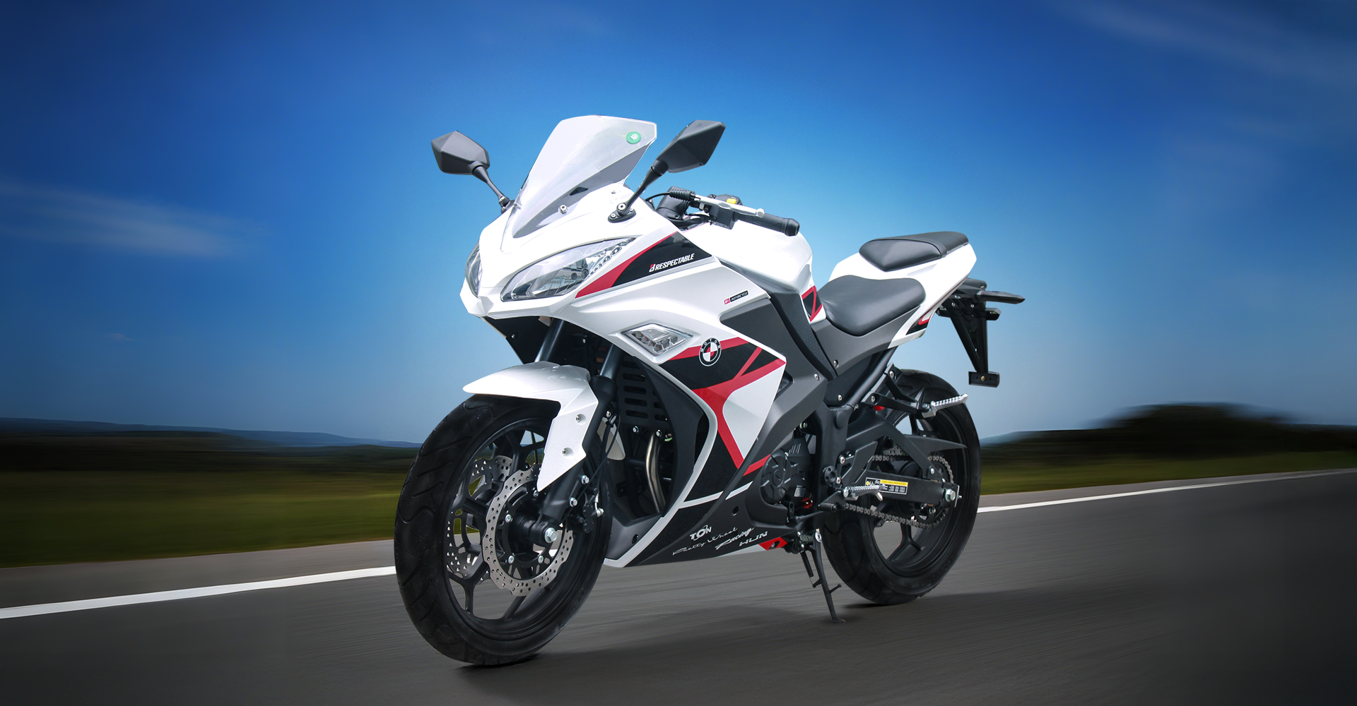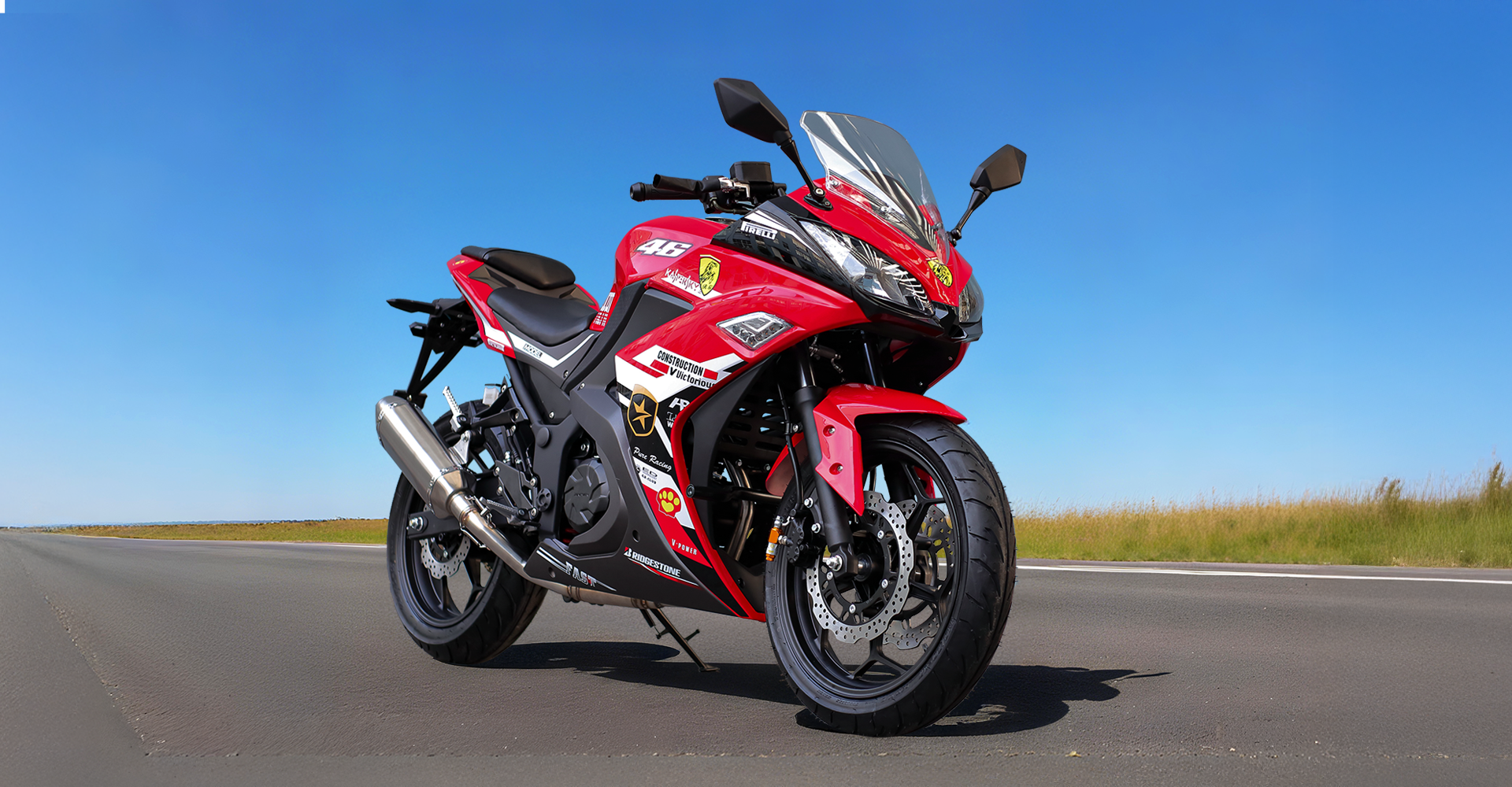 Спортивные бескамерные шины размерности 110/70-17 (передняя) и 140/70-17 (задняя) обеспечивают уверенное сцепление с любым типом дорожного покрытия.
