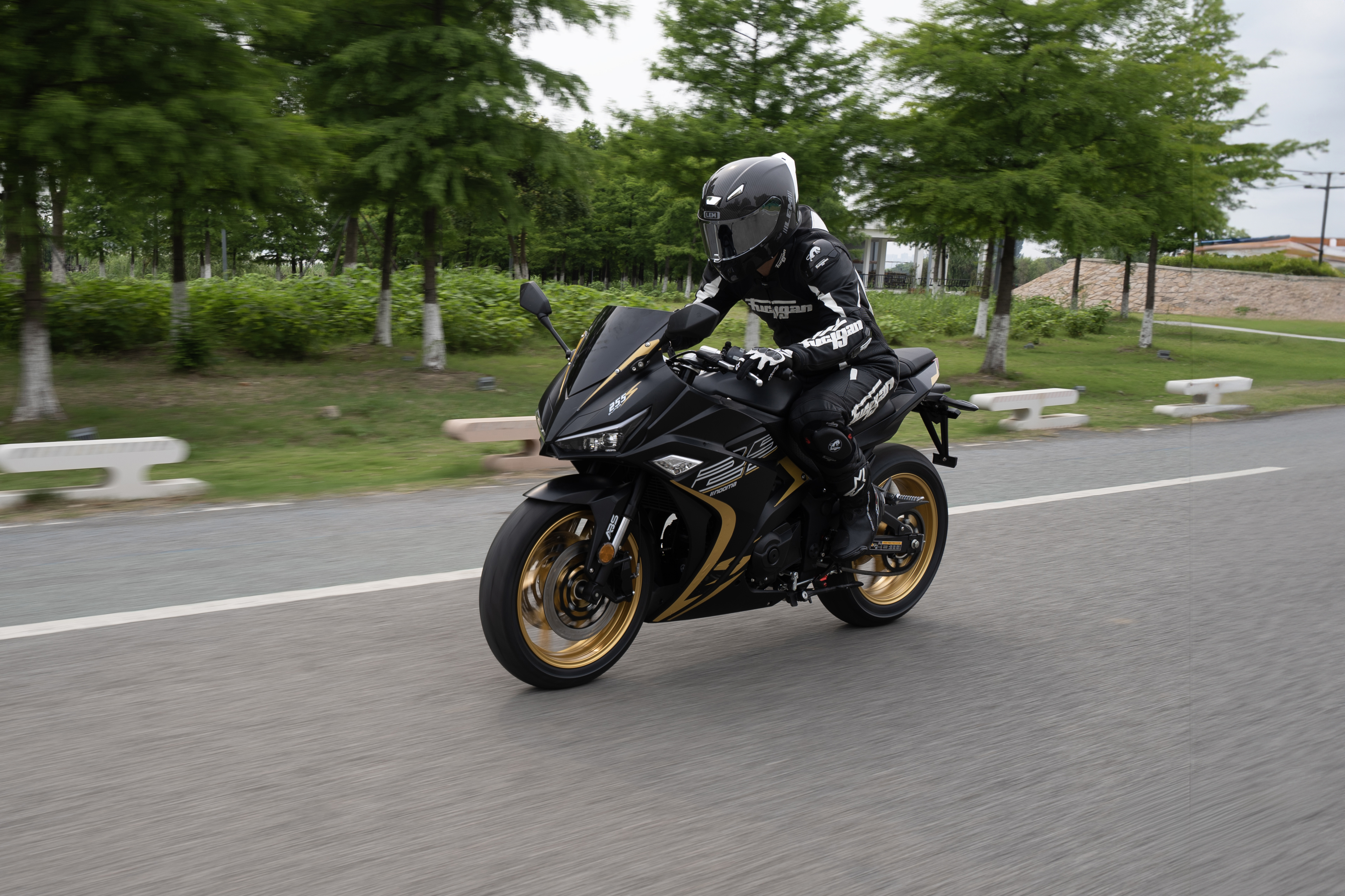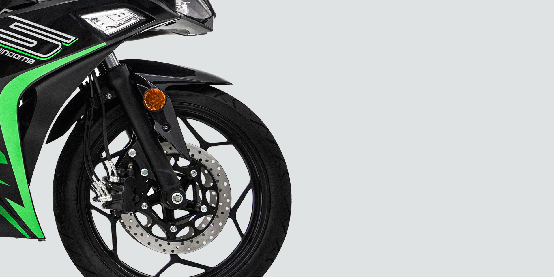 Спортивные бескамерные шины размерности 110/70-17 (передняя) и 140/70-17 (задняя) обеспечивают уверенное сцепление с любым типом дорожного покрытия.